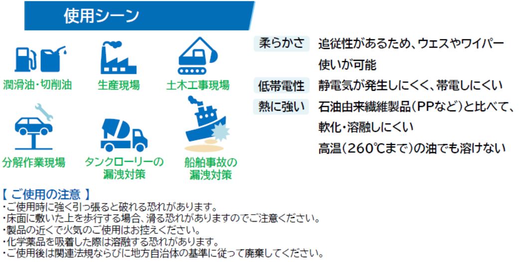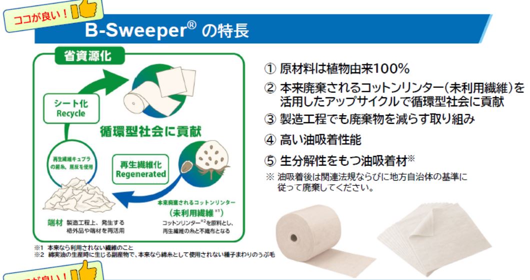 用途: B-Sweeper® は環境に配慮したアップサイクル型の油吸着材(不織布シート)です。現場の油処理・清掃と、製造工程から環境に配慮した活動が可能です。油を扱う全ての業種のみなさまにお勧めいたします。